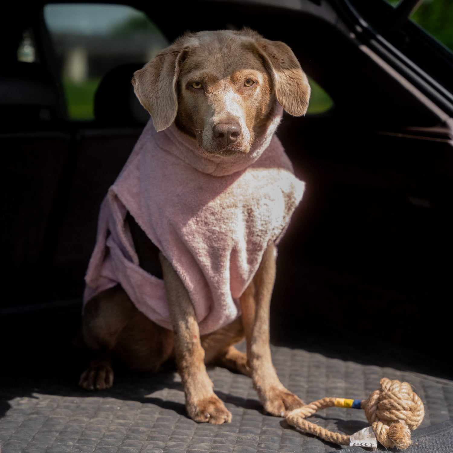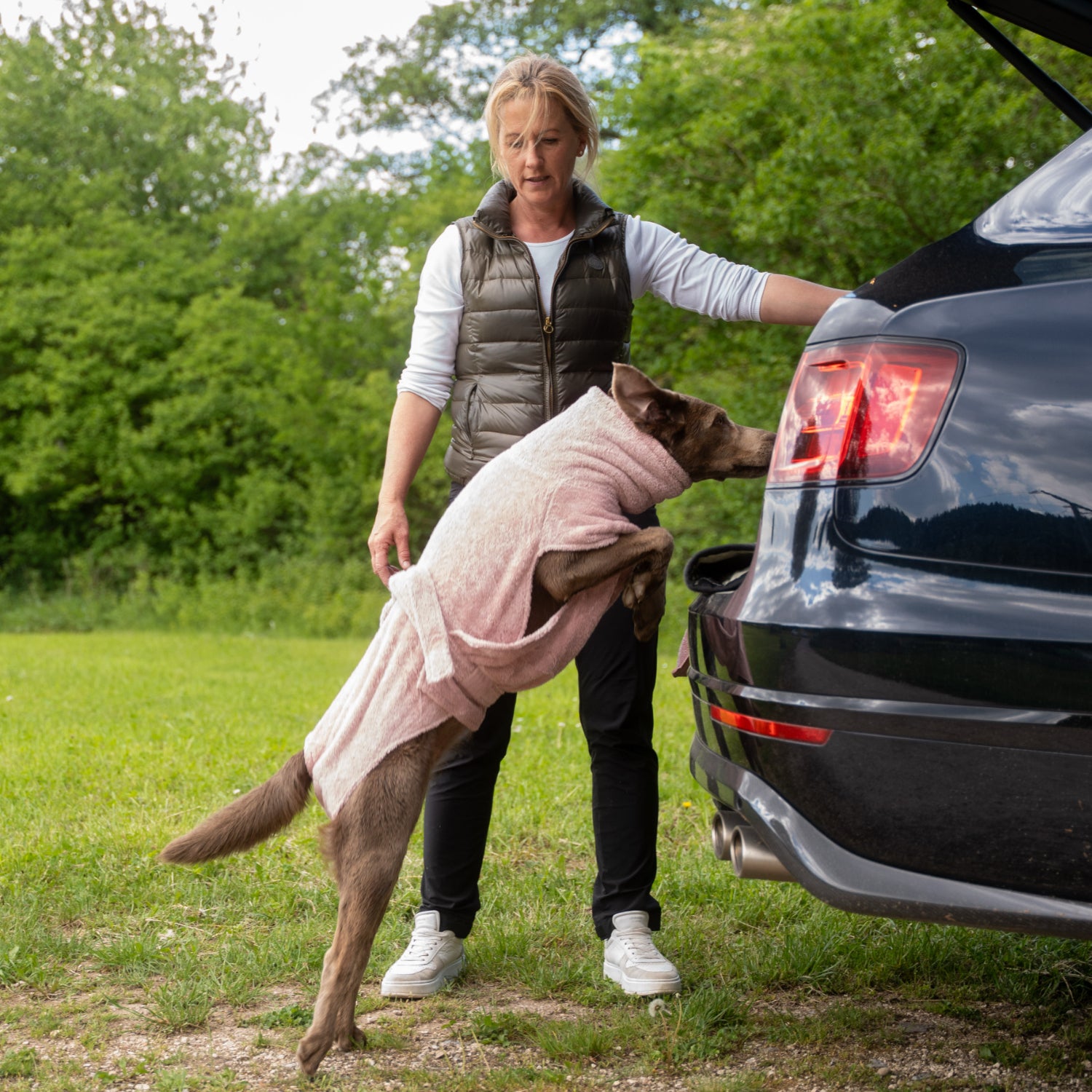 Viele Hundebesitzer legen den Bademantel bereits direkt nach dem Spaziergang vor dem Auto an, so ist der Hund bereits angetrocknet und nicht mehr triefend nass wenn man Zuhause ankommt