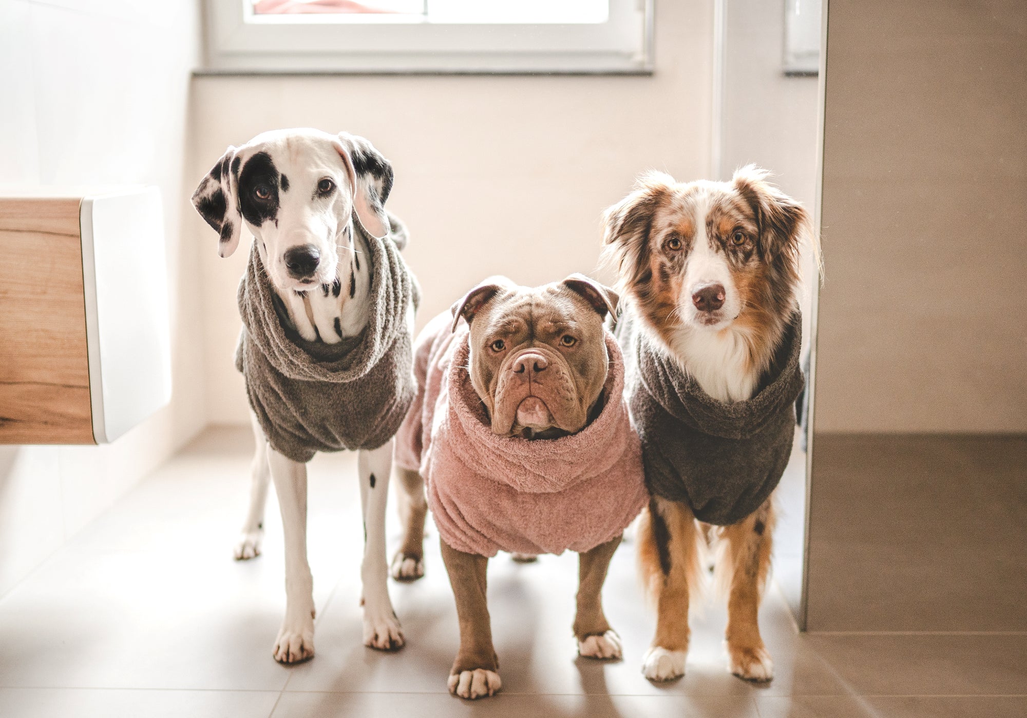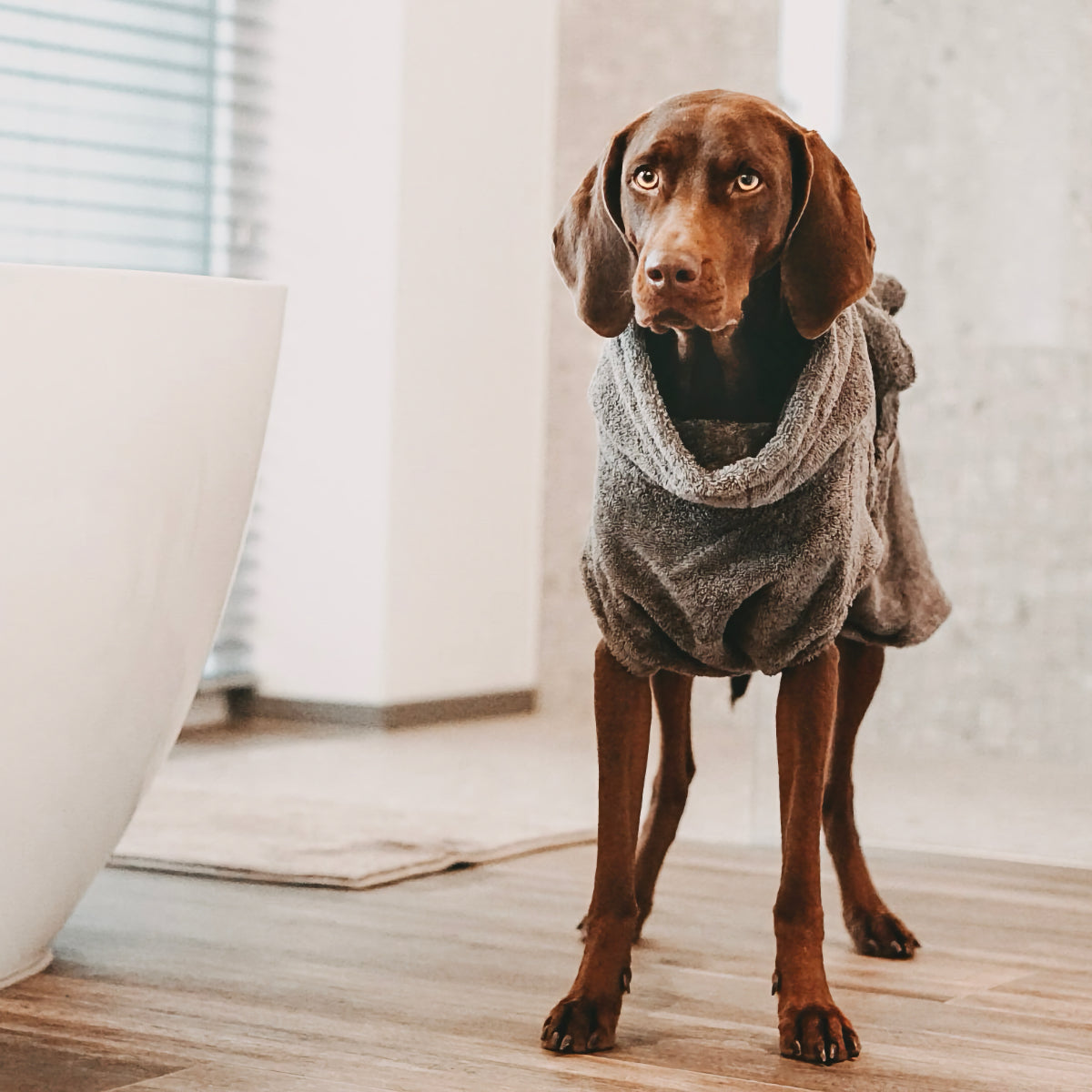 Auch wenn es erstmal nicht so klingt, ein Hundebademantel ist ein rein funktionales und sehr sinnvolles Kleidungsstück für Hunde, welches dabei hilft da nasse Fell schnell zu trocknen und dabei die Umgebung (Wände, Fenster, Auto etc.) vor Spritzern zu schützen.