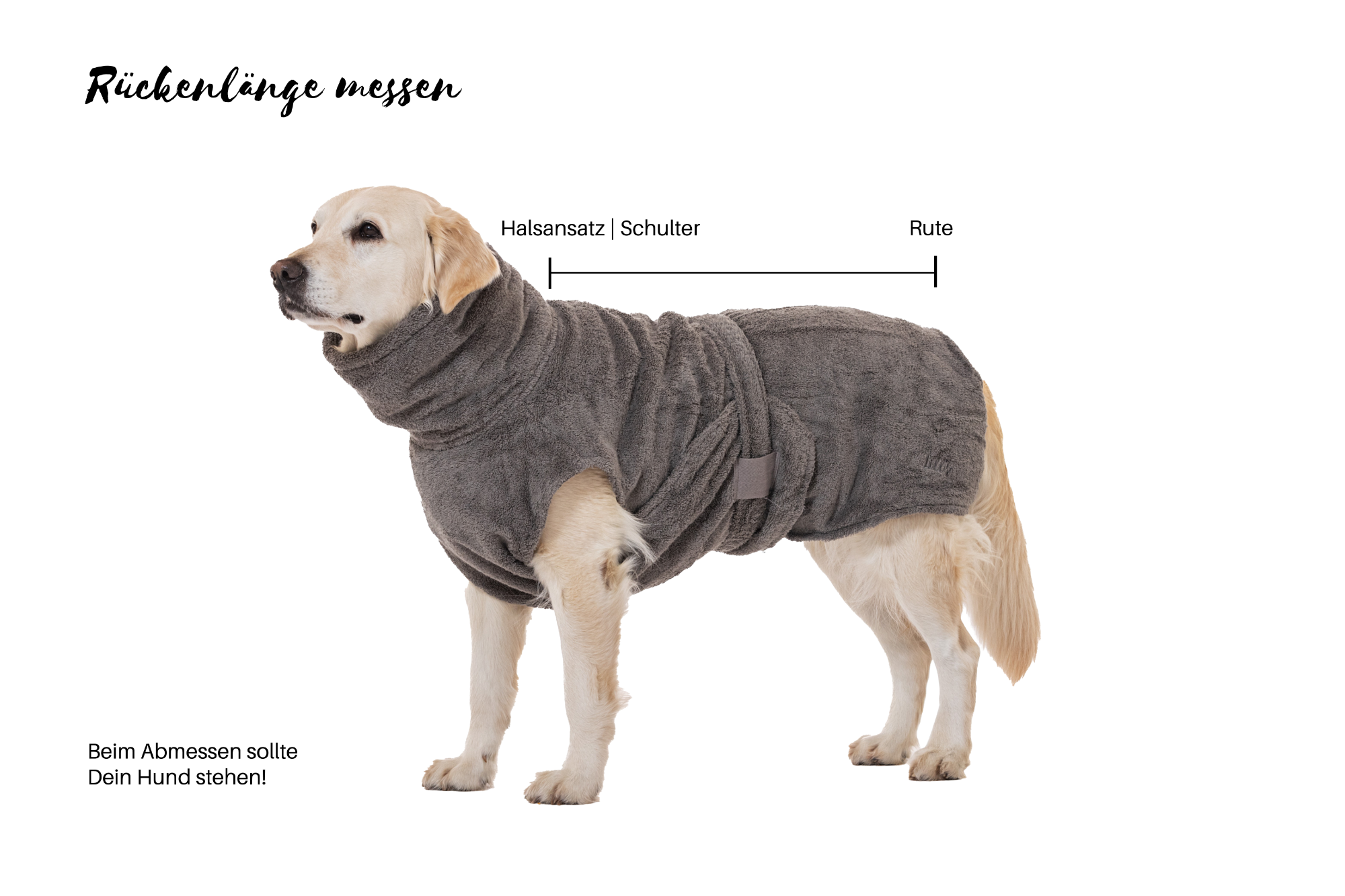 Um die richtige Größe zu wählen, benötigst Du die Rückenlänge Deines Hundes. Diesen misst Du an dem stehenden Hund von der Schulter bis zum Ansatz der Rute. Das Gewicht des Hundes spielt bei der Auswahl der Größe keine Rolle.